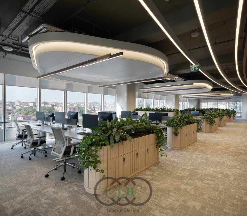 Không gian xanh đang trở thành xu hướng tất yếu trong mọi giải pháp thiết kế văn phòng trong nhà máy hiện đại. CDC Việt Nam Group đặc biệt chú trọng việc đưa cây xanh và ánh sáng tự nhiên vào từng khu vực làm việc, giúp tạo nên môi trường làm việc thân thiện và lành mạnh. Cây xanh được bố trí ở nhiều vị trí: sảnh tiếp khách, góc bàn làm việc, khu pantry, hoặc dọc hành lang — vừa giúp thanh lọc không khí, vừa mang lại cảm giác thư giãn. Ngoài ra, CDC ưu tiên sử dụng kính cường lực lớn, giếng trời và rèm xuyên sáng, giúp tận dụng tối đa ánh sáng tự nhiên, giảm phụ thuộc vào ánh sáng nhân tạo và tiết kiệm năng lượng.