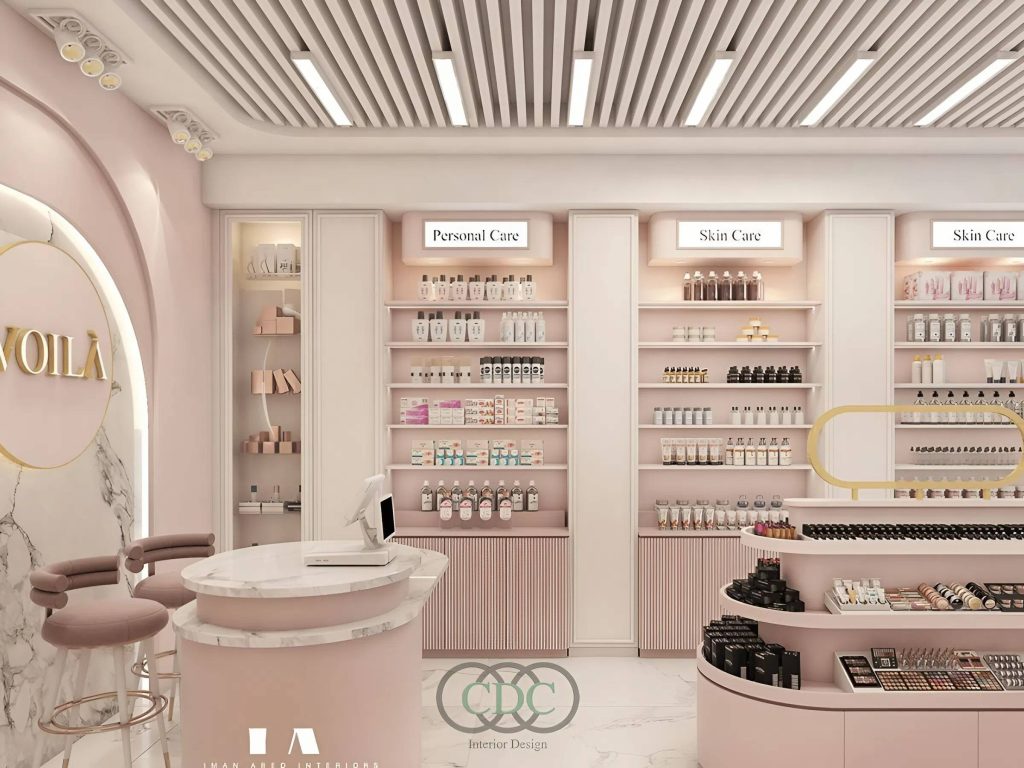 Showroom mỹ phẩm: cần quầy thử sản phẩm, ánh sáng chuẩn màu da và thiết kế mở để khuyến khích trải nghiệm trực tiếp.